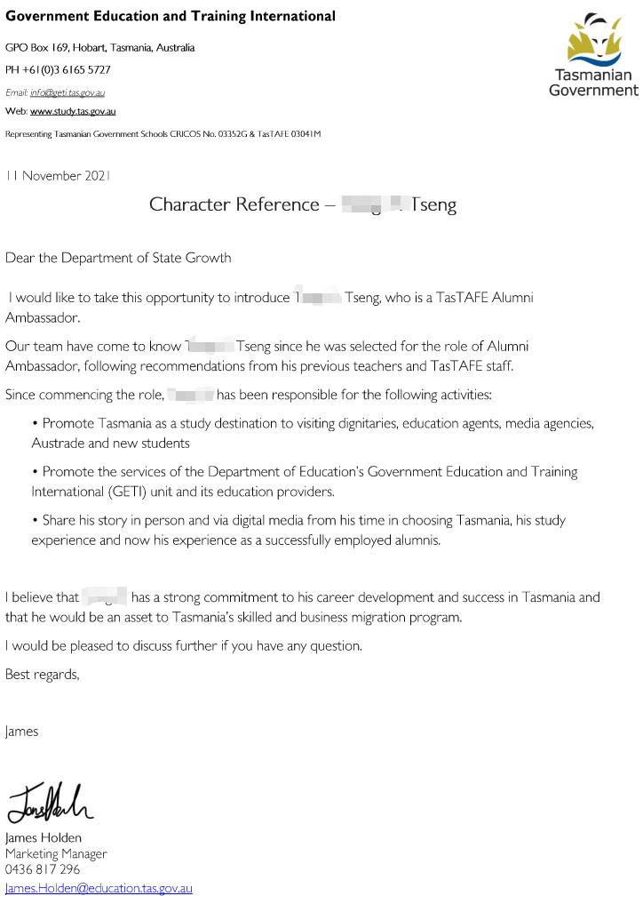 舉例~這是我一位客戶,在塔省讀完廚師課程,不僅獲得傑出TAS TAFE校友殊榮,還幫塔省教育廳作『學術推廣』、被當地媒體採訪,並獲得塔省教育廳的推薦信,您說:在申請州擔保時,附上這些『貢獻』,申請人會不會受到『優先』青睞呢?